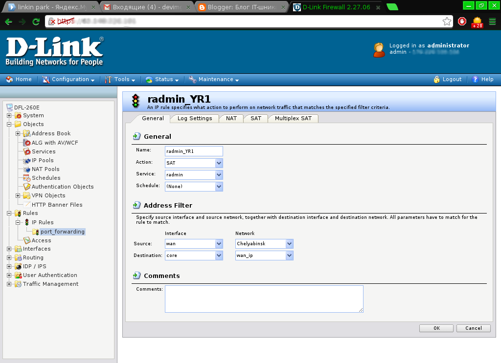Теперь нужно создать правила для доступа к внутренним сервисам снаружи. Для примера откроем порт RAdmin’а на один из компьютеров. Для правил проброса портов я создал папку port_forwarding, чтобы не запутаться в правилах. Создаем новое правило SAT. Выбираем нужный порт (предварительно создаем его, если нестандартный). Source Interface - wan, Source Network - нужная подсеть или all-nets, Destination Interface - core, Destination Network - wan_ip.