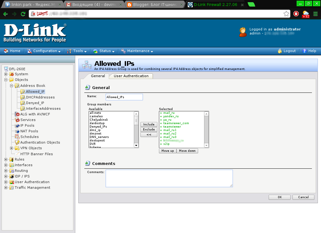 Идём в Objects - Address Book. По дефолту там уже созданы 2 папки - InterfaceAddresses и DHCPAddresses, и адрес all-nets - 0.0.0.0/0, означающий все возможные адреса сети. Я создал несколько адресов, принадлежащих моей локалке и папку Allowed_IP, в которой будут содержаться айпишники разрешенных сетей. В поле Address можно писать не только IP-адрес, но и целую подсеть, например 192.168.0.0/24. Не забывайте после операций по настройке сохранять конфигурацию Configuration - Save and Activate.